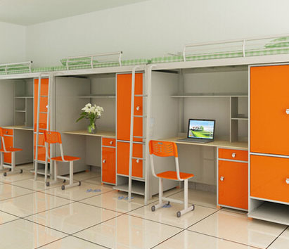 公寓床是由床、书柜、衣柜、书桌和梯架组成。书柜和衣柜连接在床架床腿内侧,书桌将书柜、衣柜连在一起,床架有书柜的一头安装有梯架,床架的另一头与梯架同侧有护栏,书桌的桌面下有键盘支架和抽屉架。由于床是立体空间组合,不仅节省了空间,而且整齐美观,又便于管理。
